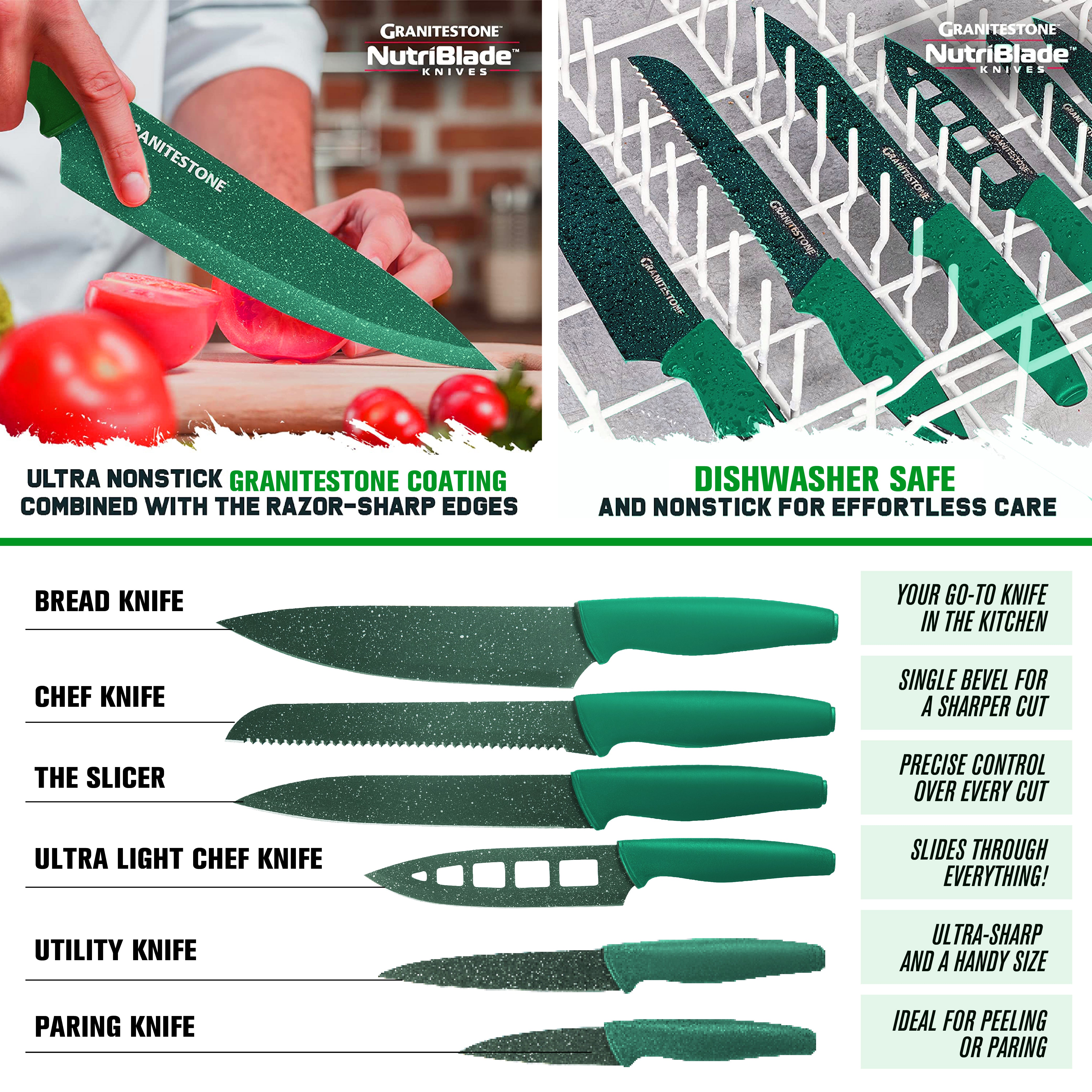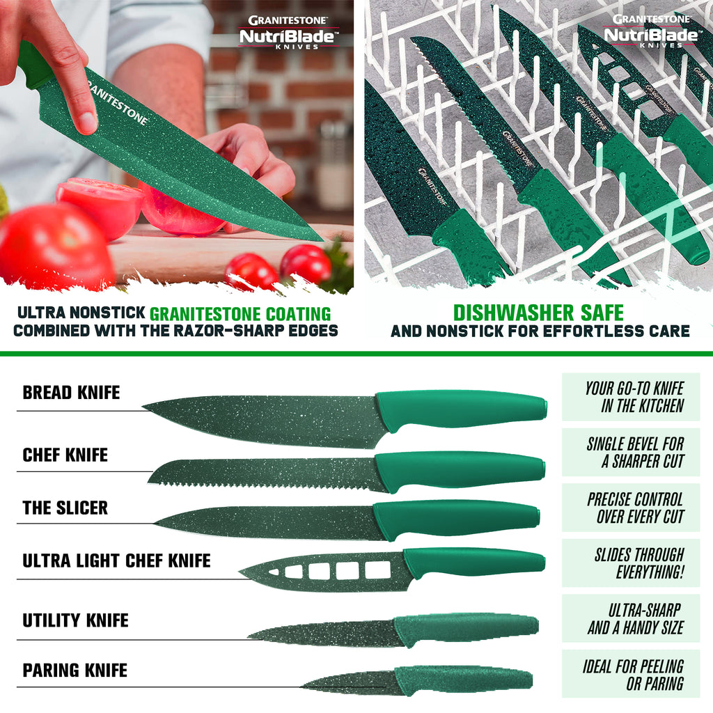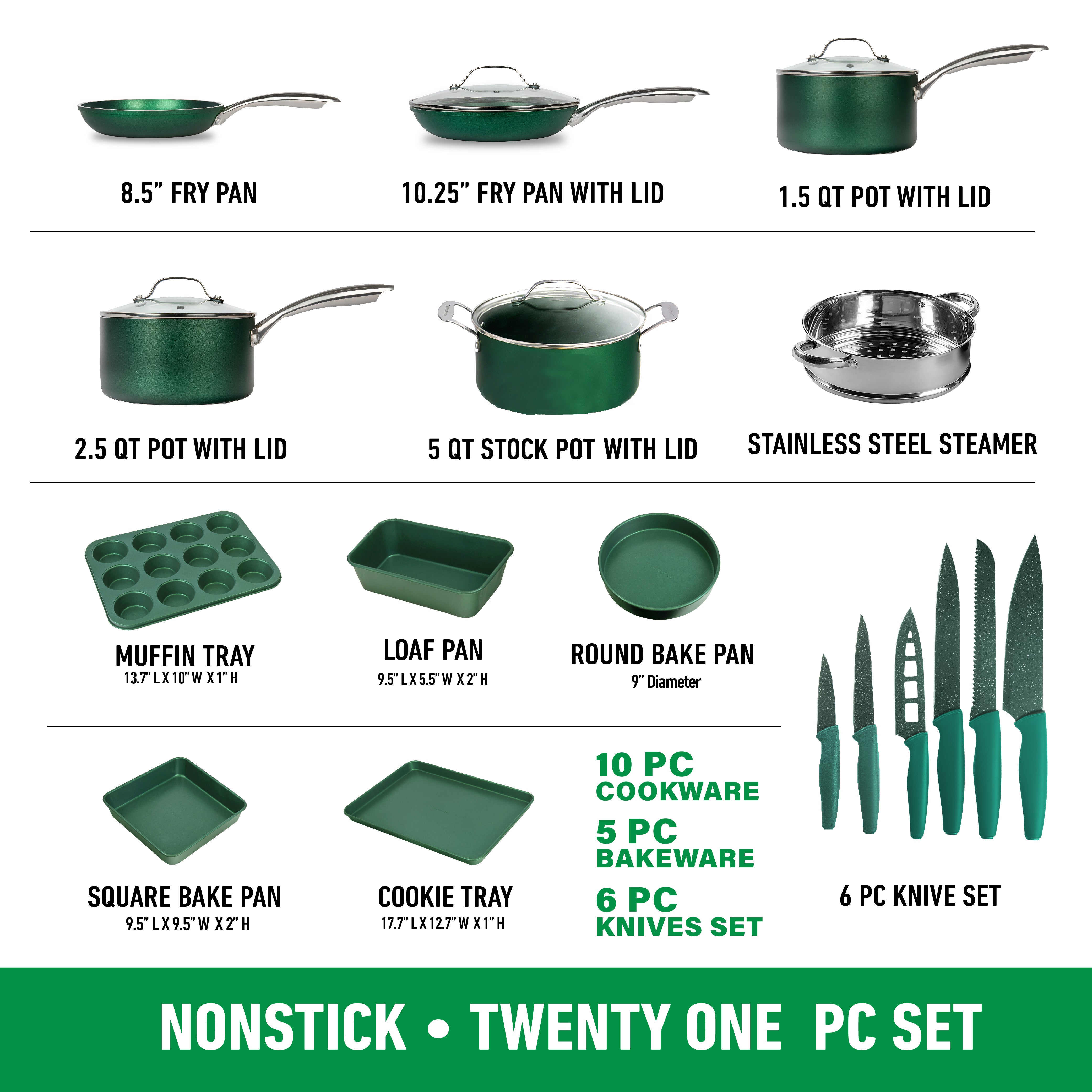 • Complete Kitchen in a Box: Includes an 8” frying pan, 10.25” frying pan with lid, 1.5 Qt saucepan, 2.5 Qt saucepan with lid, 5 Qt stockpot with lid, 5-piece bakeware set, and a 6-piece Nutriblade knife set.