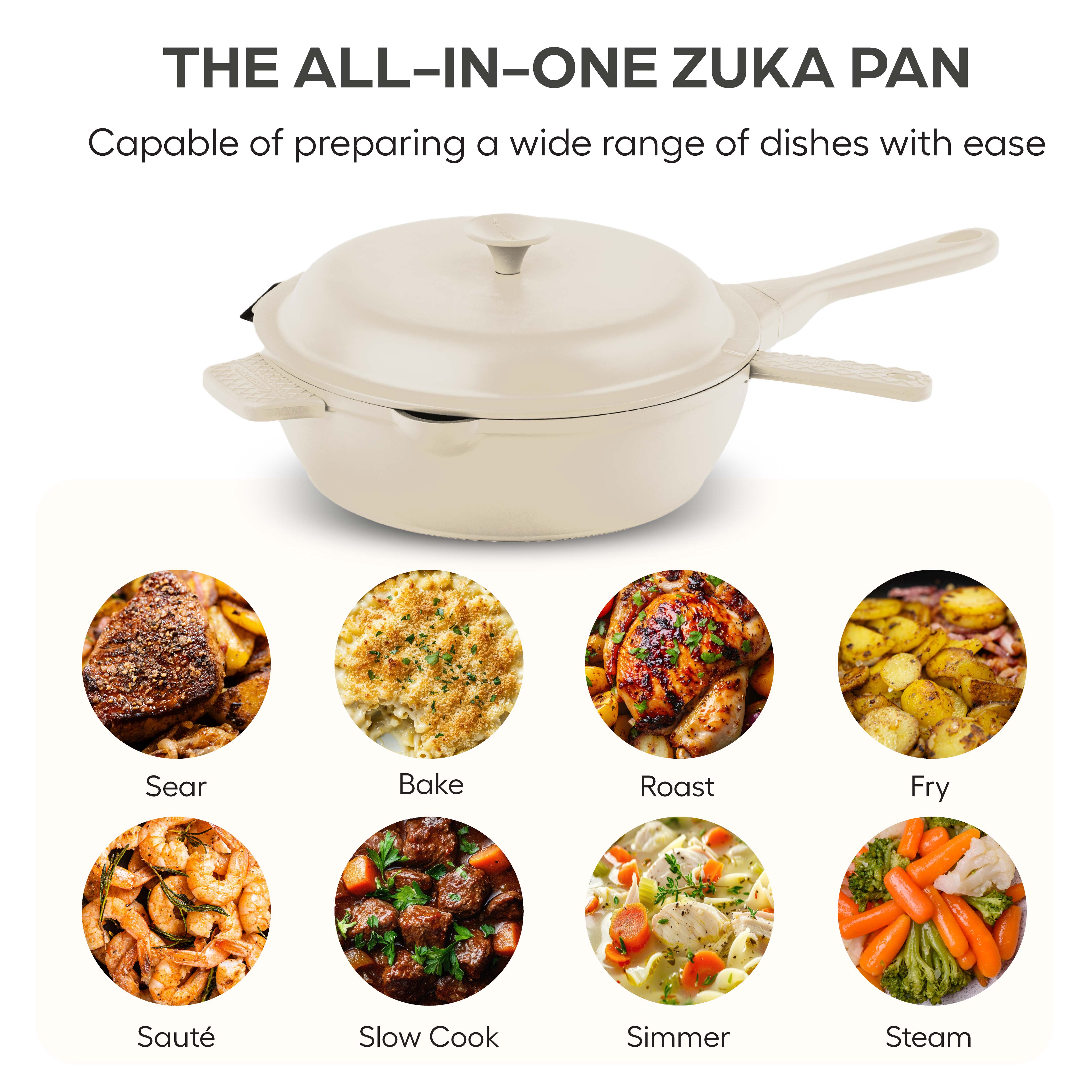 • Multi-Functional Design: Seamlessly sear, bake, roast, slow cook, fry, braise, sauté, simmer, boil, and serve—all with one pan.