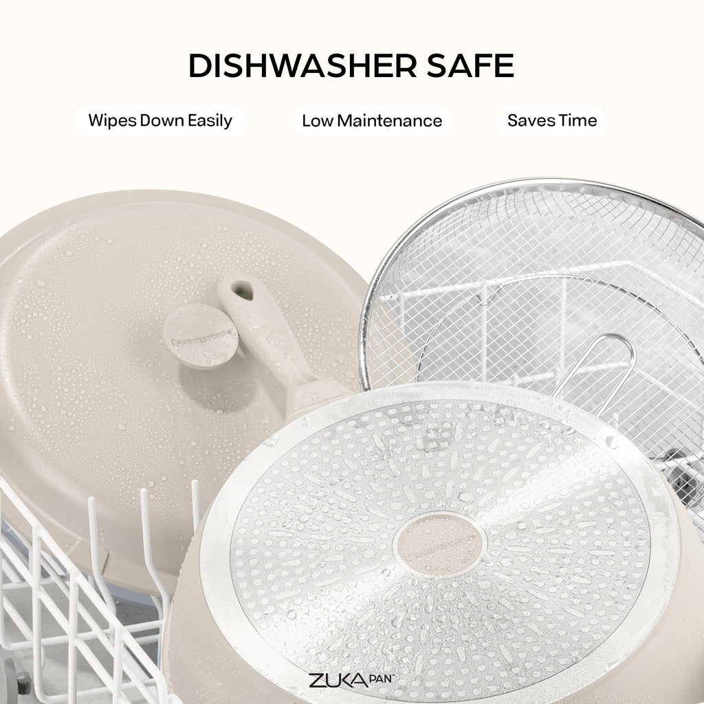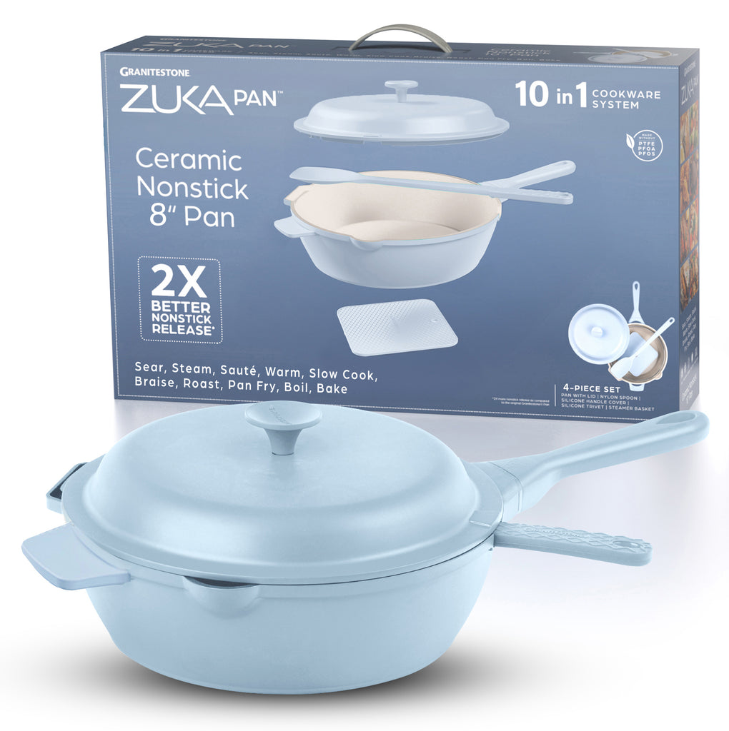 Simplify your meal preparation and elevate your culinary creations with Granitestone's everyday pan set — the Zuka Pan. Crafted from durable cast iron aluminum with a triple-coated non-stick ceramic surface, this versatile pan ensures fast, even heating and effortless cleanup.